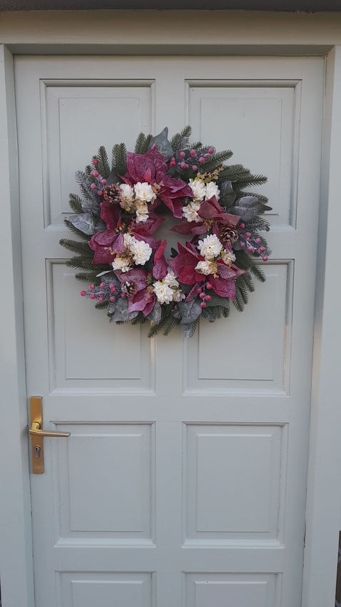 A beautiful and substantial Christmas wreath packed with pine branches, frosted red poinsettias, red-berried branches, frosted pinecones, cream chrysanthemums, frosted leaves and foliage. Elegant and timeless, you will look forward to putting this on your door year after year.