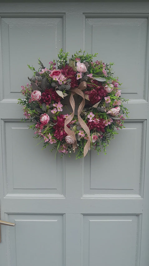Burgundy is the colour of the season so this wreath is bang on trend and so pretty. Deep burgundy/green chrysanthemums with pink/burgundy camellias, pink gypsophila and forget-me-nots complemented by green foliage, boxwood and thistles.