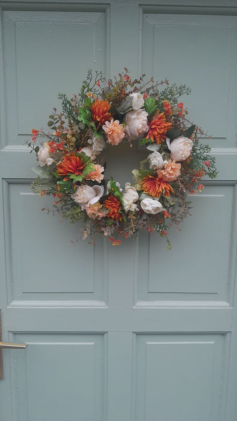 Vibrant orange chrysanthemums with cream peonies, peach and cream dahlias, orange nemesia, autumn boxwood, autumn eucalyptus and asparagus leaves. This wreath is made on a 30cm natural wicker base and measures approx. 45cm in diameter.
