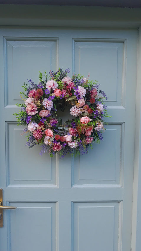 Red, coral, pink, indigo and violet - a beautiful colour palette composed of red santolina, coral camellias, light pink and two-tone pink dahlias, lupins and lavender, finished with green boxwood and purple forget-me-nots. This would be gorgeous on a red or navy door.