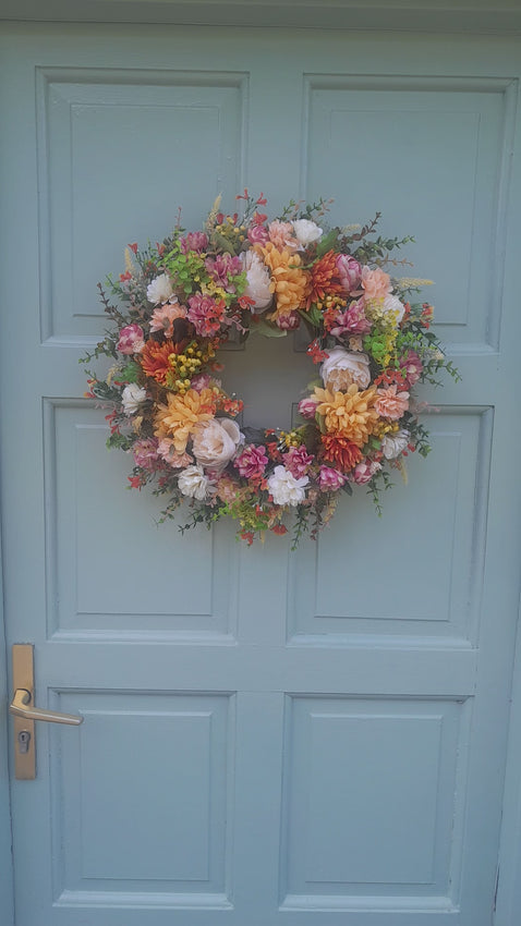 A very full wreath packed with colourful flowers and foliage. Gorgeous gold and orange chrysanthemums, cream peonies, peach, pink/green and cream dahlias, two-tone pink camellias, yellow tansy, yellow-tipped boxwood, yellow heather and orange nemesia with autumn boxwood and eucalyptus combine to make this a showstopper wreath! It is pure joy for your front door and a lovely welcome home. This would suit any door colour.