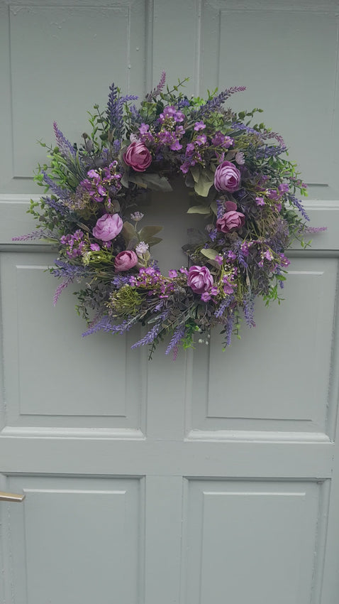 A dreamy combination of lilac and purple tones - camellias, heathers, lavender, gypsophila with eucalyptus and assorted green foliage.This wreath is made on a 30cm grey wicker base and measures approx. 50cm in diameter.