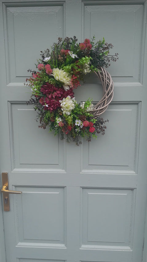 Gorgeous burgundy (the colour of the season!) and light green chrysanthemums with coral red santolina, red and white tipped boxwood, asparagus leaves, eucalyptus, burgundy thistles and white/green forget-me-nots - this substantial wreath is packed with flowers and foliage.