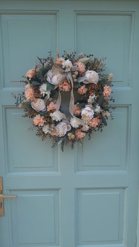 Very pretty and autumnal - Cream peonies with peach and cream dahlias, autumn boxwood, autumn eucalyptus and thistles in beautiful harmonious autumn shades. This wreath is finished with a hessian ribbon.