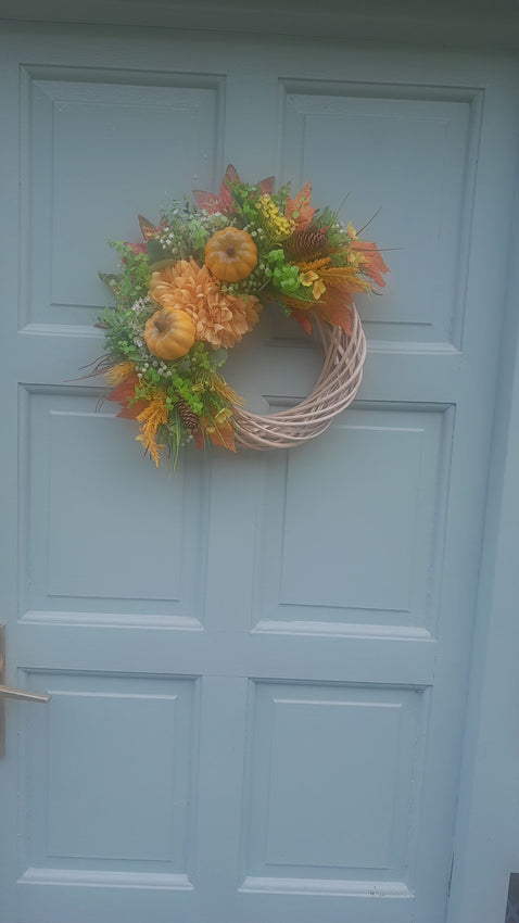Beautiful golden chrysanthemums, pumpkins, maple leaves, sheaves of corn and golden foliage, yellow forget-me-nots, pinecones, tansy and colour-tipped boxwood combine in this very joyful autumnal wreath.