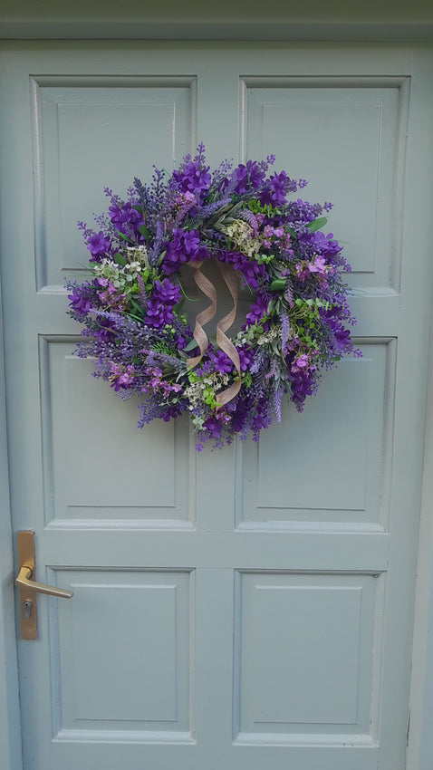 Deep purple lilacs, lavender and lupins with lilac gypsophila, colour-tipped boxwood and lilac heather finished with a hessian ribbon echoing Rapunzel's flowing hair. The perfect multi-season wreath!