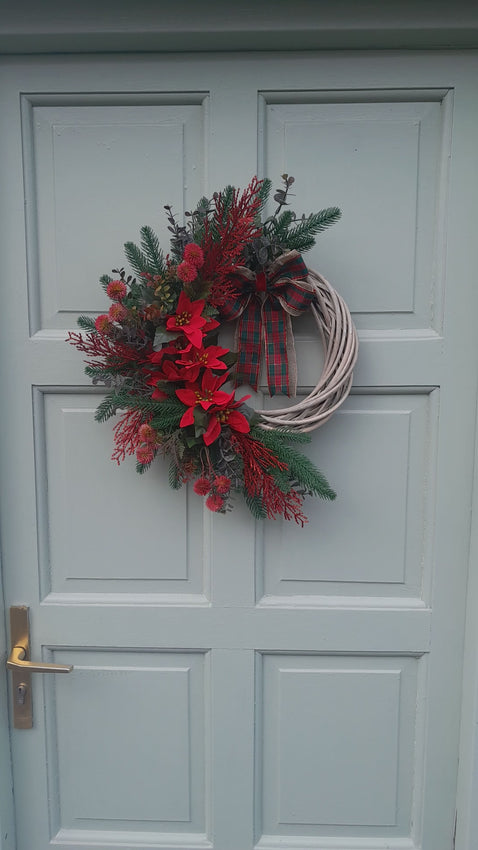 It's a classic! Beautiful vibrant red poinsettias with red thistles, red glitter twigs and eucalyptus on a bed of pine branches. This wreath is finished with a tartan, hessian and red velvet bow.