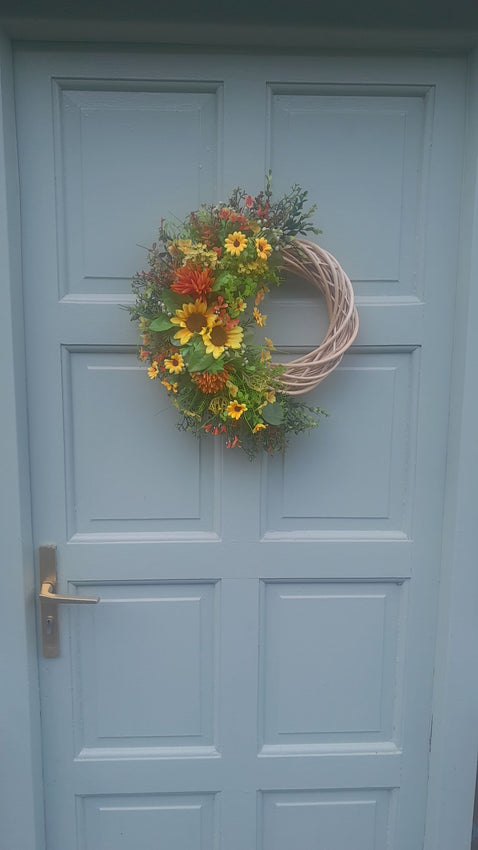 A celebration of autumn colour - yellow sunflowers, orange chrysanthemums, orange nemesia, yellow forget-me-nots, green boxwood, tansy and asparagus leaves and autumn eucalyptus combine in a harmonious way in this joyous wreath.